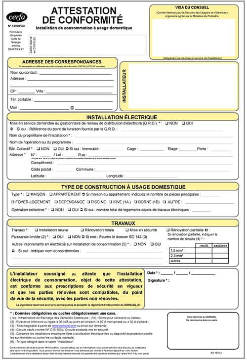 Après le raccordement, le client reçoit une attestation de conformité baptisée Consuel. Ce document certifie que l’installation électrique répond aux normes en vigueur. Sans cette attestation, le consommateur ne pourra pas souscrire un contrat d’électricité ni demander l’ouverture de son compteur électricité.