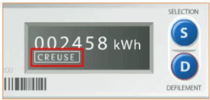 Il suffit d’effectuer une impulsion sur le bouton D (défilement). Le relevé de compteur à 6 chiffres (zéros inclus) s’affiche alors.